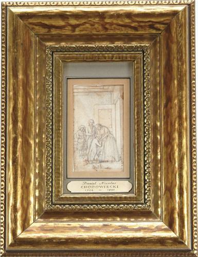 DANIEL NIKOLAUS CHODOWIECKI (German, 1726-1801) THE PROPOSAL. Pencil and ink drawing of an interior scene showing a man on his knees kissing the hand of a young lady while two men look on. Housed in a nice copper/bronze gilt molded wood frame with glass having a matte with identification tag. SIGHT SIZE: 4-1/4in. x 2-1/2in.. CONDITION: Foxing and bleed through writing on bottom of picture. 9-26455