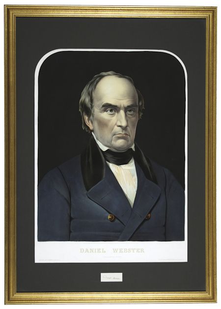 (1782 - 1852) American lawyer and statesman who verbally jousted with Calhoun in the Senate and later supported Clay's compromise measures on slavery. Fine, bold signature on a small slip, framed with a superb, oversize color engraving of the statesman published by Julien New York, 1855. This fantastic oversize image measures more than 20" x 28" (sight), handsomely matted in dark brown and set into a gilt frame. Fine condition, perfect for display.