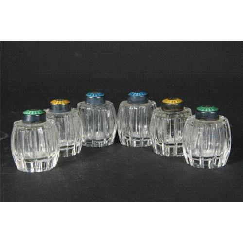 6 modernist matching salt and pepper shakers from Denmark. Each set has a matching enamaled top color coordinated (yellow, green, blue). Glass is probably crystal. Great Shape!!! need a good polishing. Normal tarnish and wear to metal lids, shear marks & normal wear.