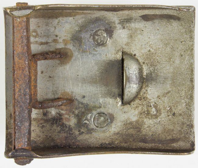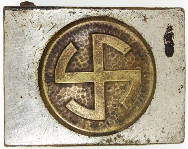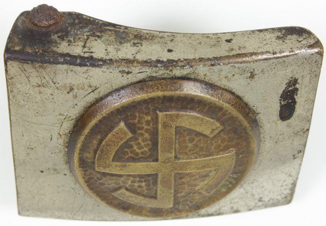 Danish SS enlisted man's belt buckle, 2 1/2" x 1 3/4" steel with brass swastika on a dimpled background affixed thereto, the emblem of Danish "Schalburg Corps" which included volunteer soldiers and civilians which was fully incorporated into the SS, disbanded in February, 1945. Some wear, still quite good.