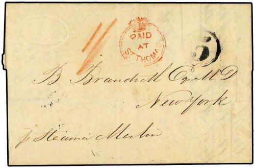 1851 (20 Feb.) Entire to NEW YORK showing fine Crowned circle PAID/AT ST. THOMAS h.s. in red with circular 5 h.s. adjacent and double arc origin d.s. on reverse.