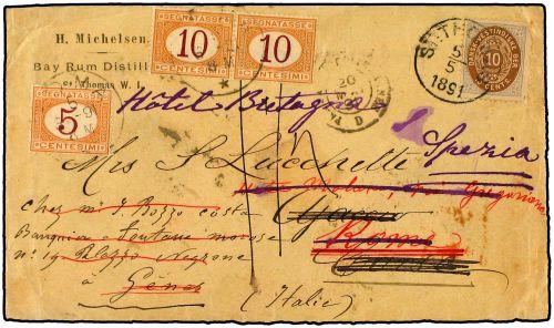 1891 ST. THOMAS a ITALIA. 10 cents. castaño y gris tasado a la llegada con sellos italianos de 5 cts. y 10 cts. (2). Diversas reexpediciones. MAGNIFICA.
