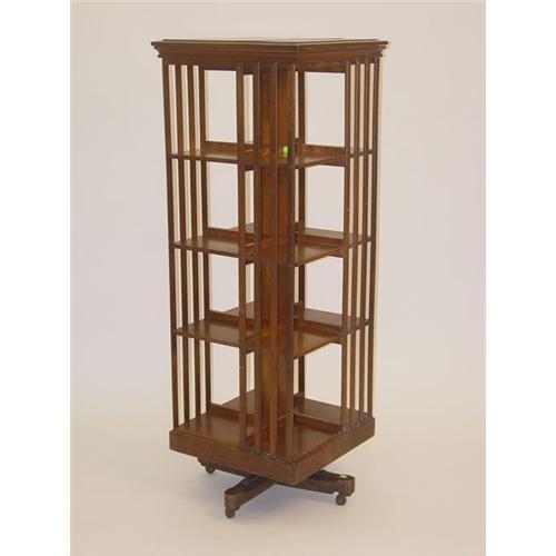 DANNER'S REVOLVING BOOKCASE - MISSION STYLE OAK W/ 4 TIERS OF SHELVES, SIGNED DANNER'S REVOLVING BOOKCASE W/ PAT. DATES 1876 & 1877 MFG. JOHN DANNER MFG. CO. CANTON OHIO (56 1/4" T X 20" W) - WEAR, TOP SEAM SEPARATIONS, IMPERFECTIONS