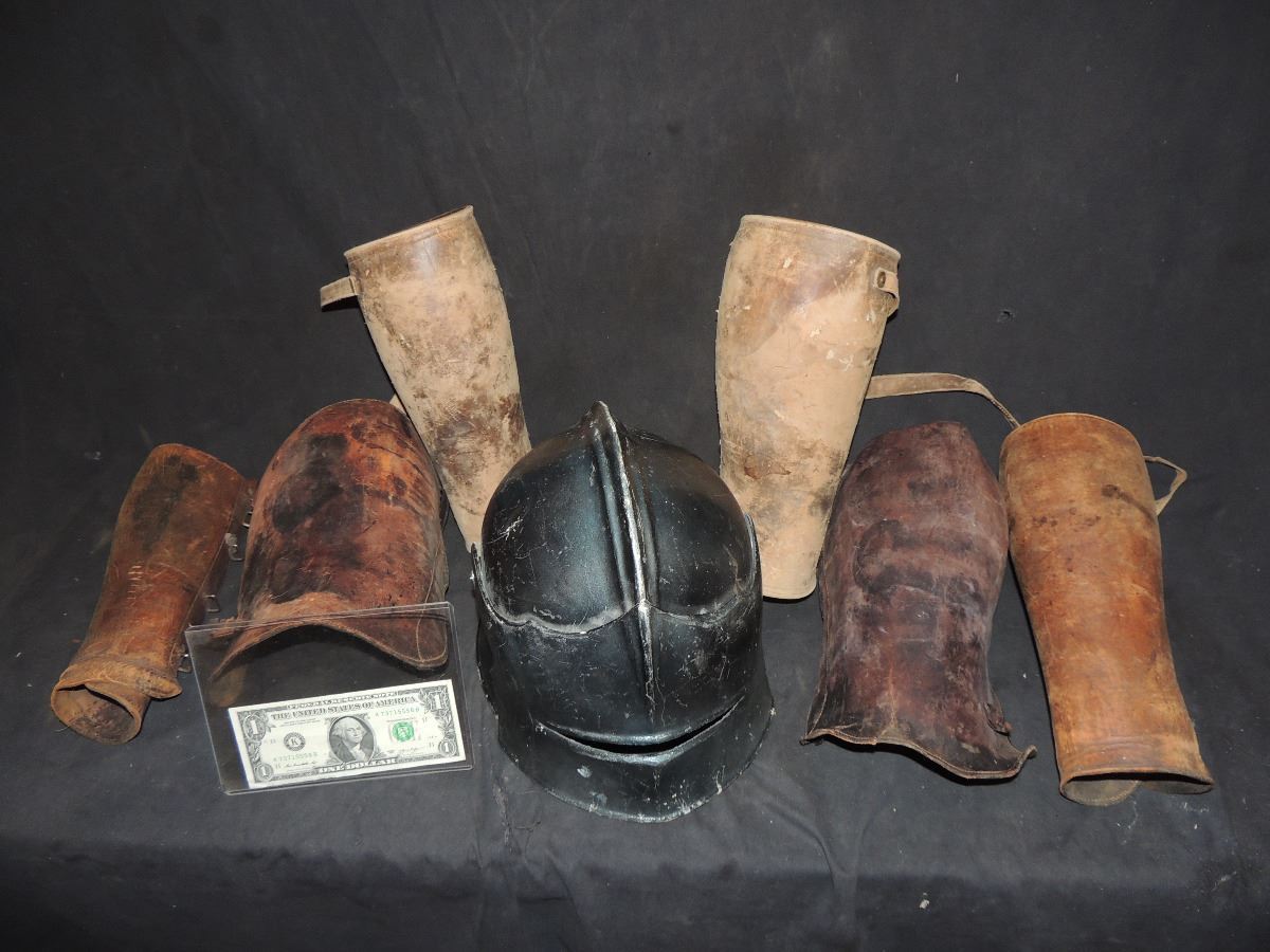 This is a Mystery lot of Vintage armor. There are several all leather gauntlets and leg armor with a very cool helmet with working face shield.