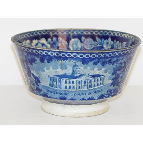 DARK BLUE HISTORICAL STAFFORDSHIRE WASTE BOWL- BALTIMORE COURT HOUSE BY HENSHALL WILLIAMSON & CO. (3" T X 5 5/8" DIA.) - SEVERAL HAIRLINES, STAINS & WEAR;