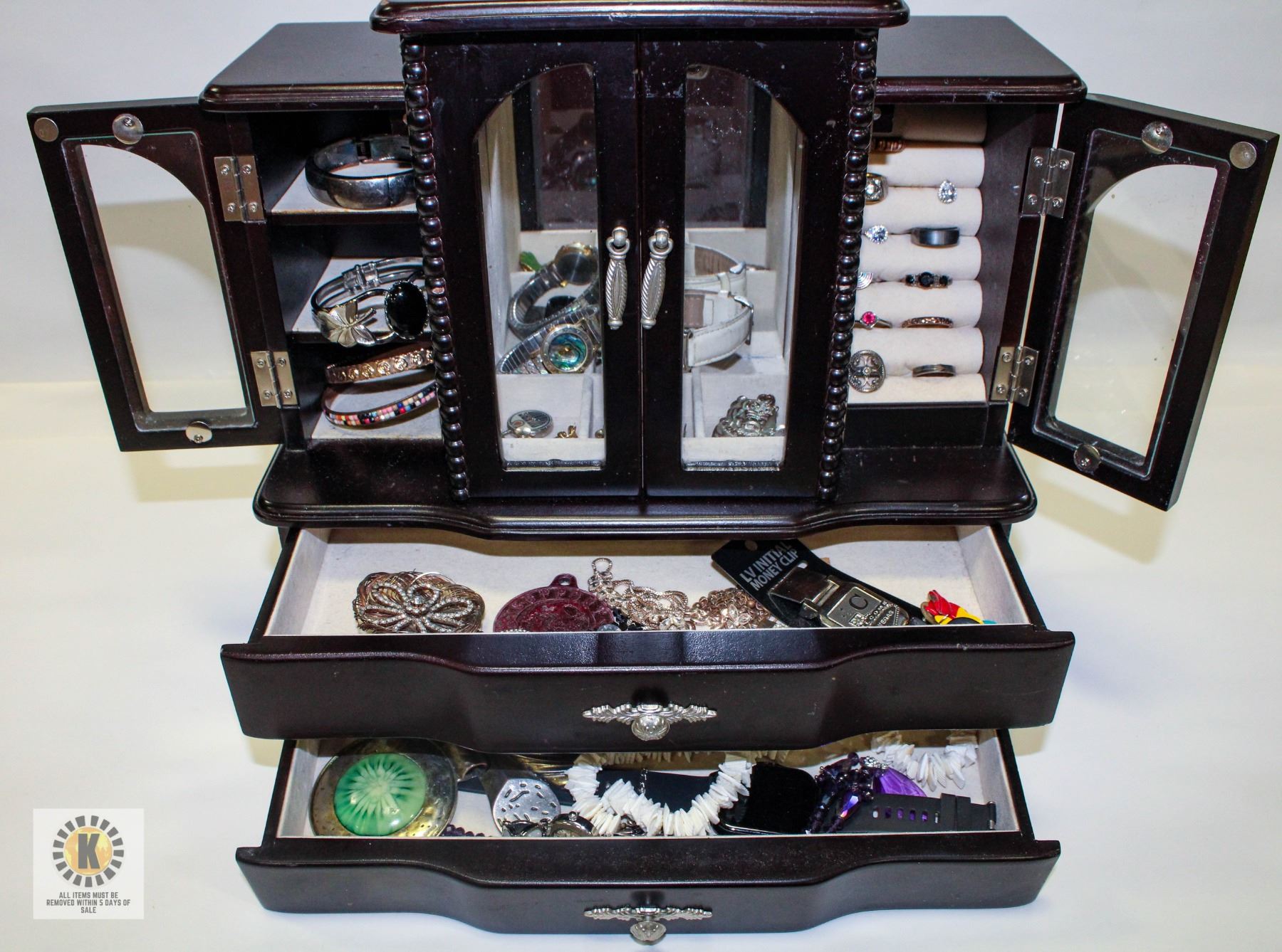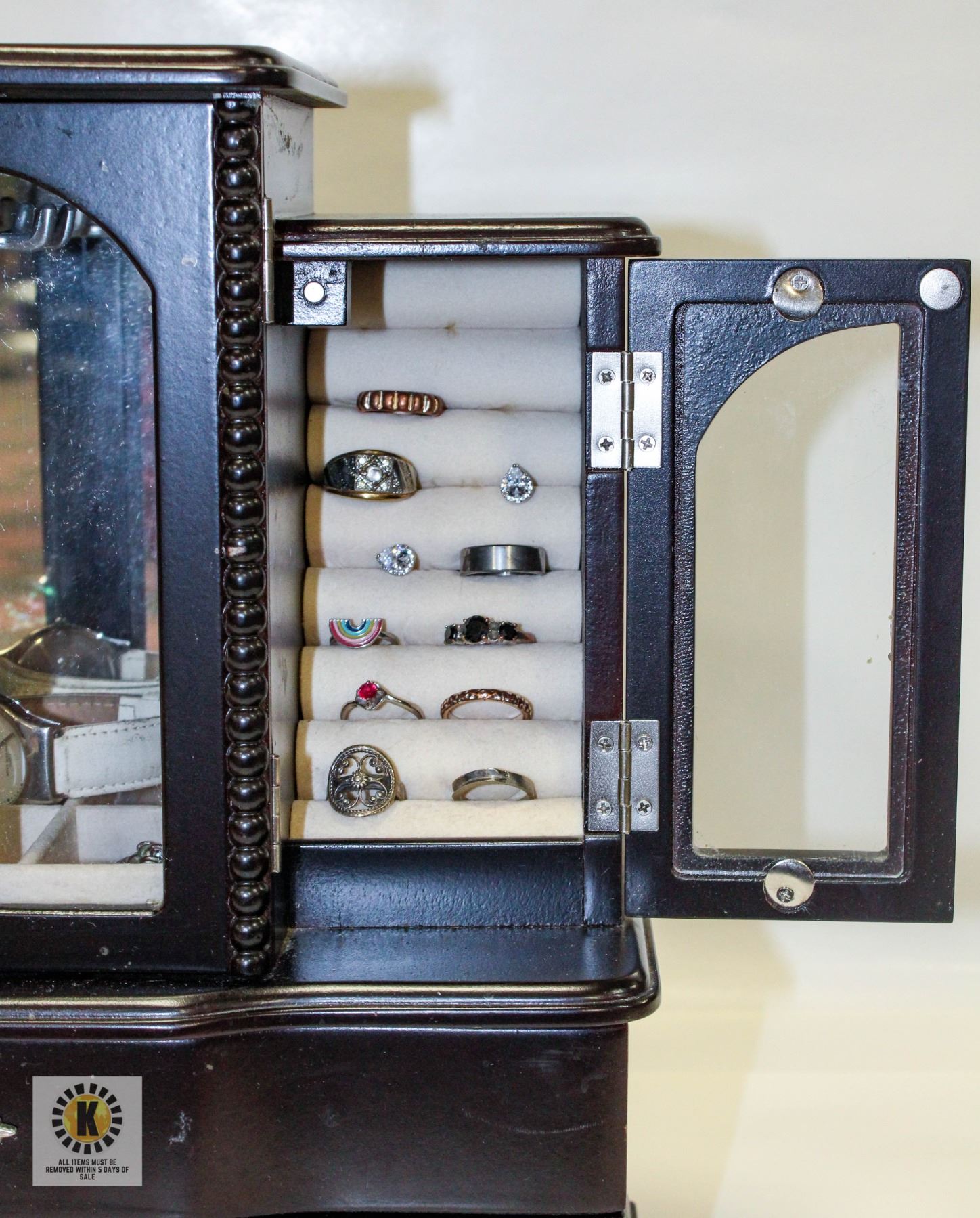 STORAGE & 2 LARGE DRAWERS WITH JEWELLERY INCL. RINGS, CHARMS, EARRINGS, BRACELETS, MONEY CLIP NECKLACES, WATCHES, ETC. **ALL ITEMS MUST BE REMOVED BY 5PM SATURDAY, APRIL 5TH 2025. ALL REMAINING ITEMS WILL BE SUBJECT TO A $6.00 PER DAY STORAGE CHARGE. ANY ITEMS REMAINING AFTER MONDAY, APRIL 21ST 2025 WILL BE CONSIDERED FORFEITED. NO REFUNDS WILL BE ISSUED FOR FORFEITED ITEMS. TO SCHEDULE A PICK UP APPOINTMENT CLICK HERE