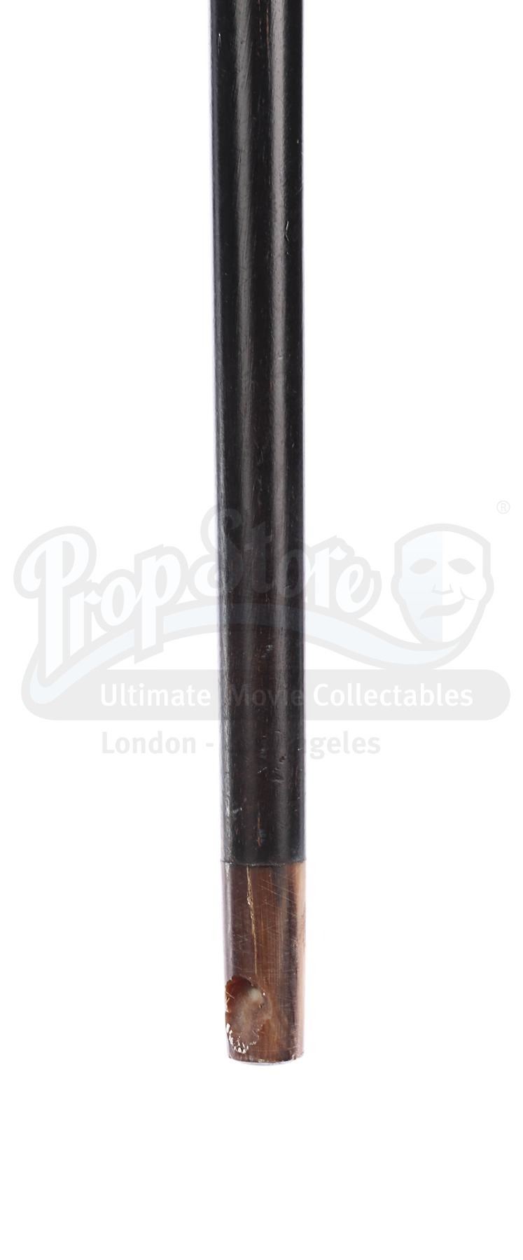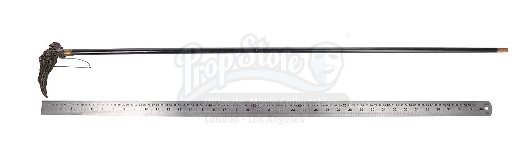The cane features the head of a Skeksis, made of resin and painted to look bronze, sitting atop a long black wooden shaft. The Skeksis is wearing a monocle with a metal chain which attaches to the collar, indicating that it is The Scroll-Keeper. There is some minor wear from age and use. The tip of the Skeksis' beak has chipped off and there are minor scratches to the wood of the shaft, while the ferrule has a small hole. Dimensions: 110 cm x 13.5 cm x 5 cm (43 1/4" x 5" x 2")
