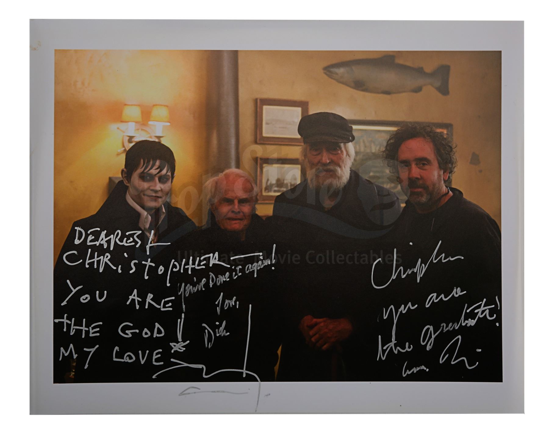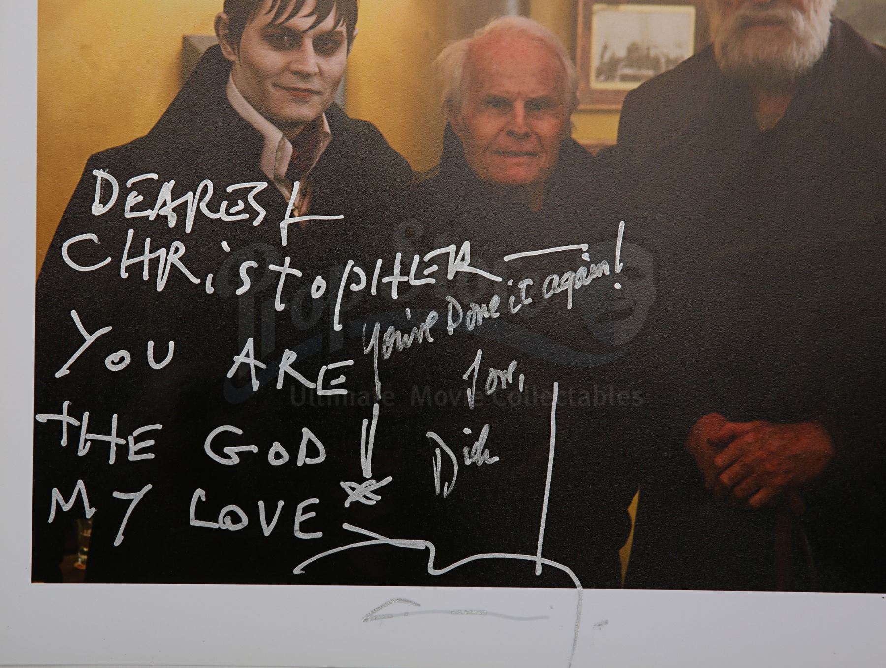 A photo autographed by Tim Burton, Johnny Depp and producer Richard D. Zanuck from Burton's horror comedy Dark Shadows. This item comes from the personal collection of legendary actor Sir Christopher Lee.