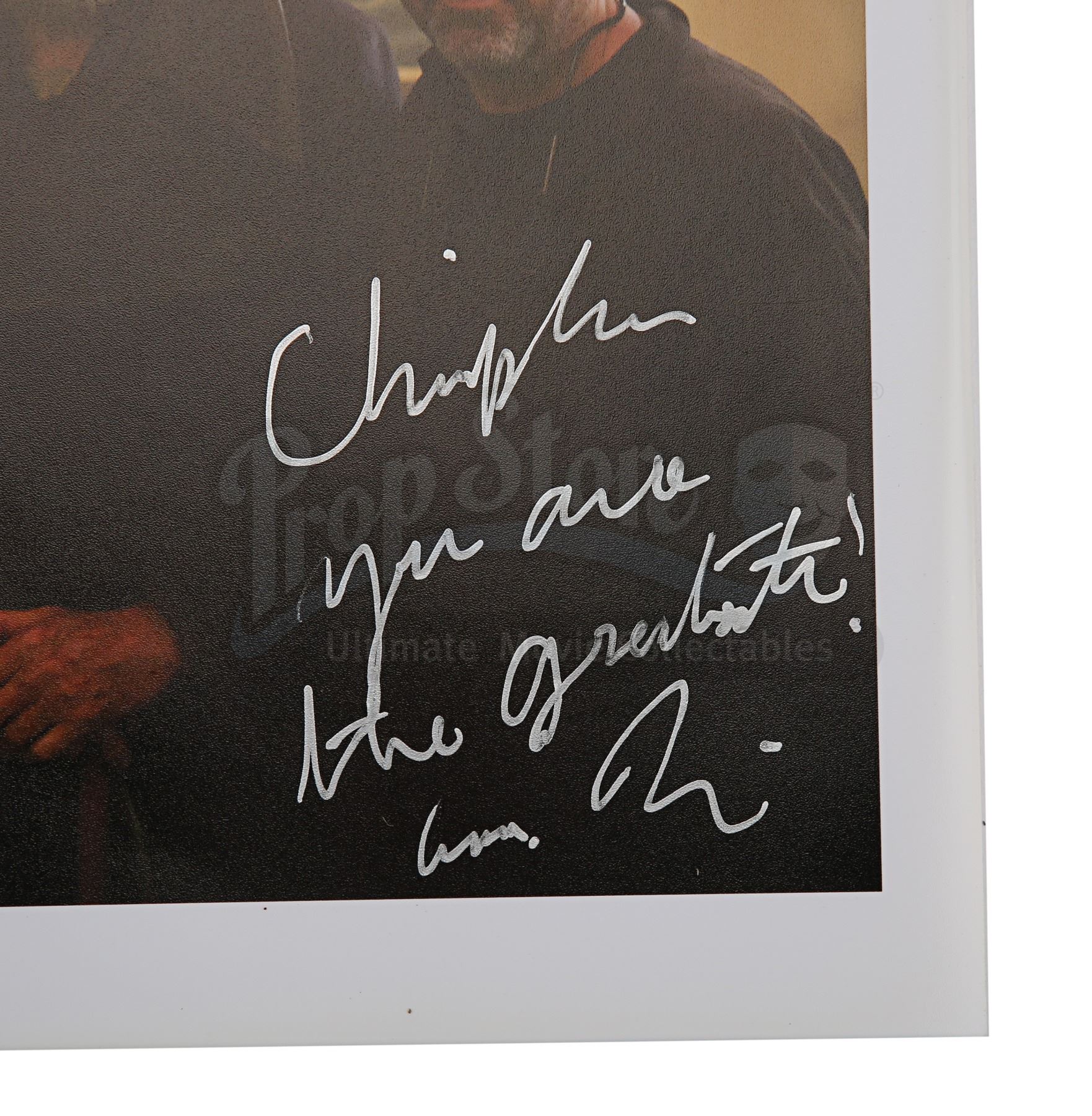 Presented in a black metal frame and set under acrylic, the photo features Depp and Christopher Lee on set dressed as their characters, alongside Zanuck and Burton. Autographed in silver pen, the photo features messages dedicated to Sir Christopher Lee. The signatures are slightly smudged in a couple of areas and the frame shows some very minor wear. Dimensions: 21 cm x 26 cm x 2 cm (8 1/4" x 10 1/4" x 3/4")