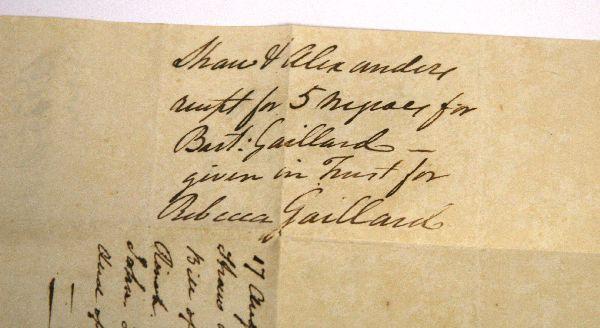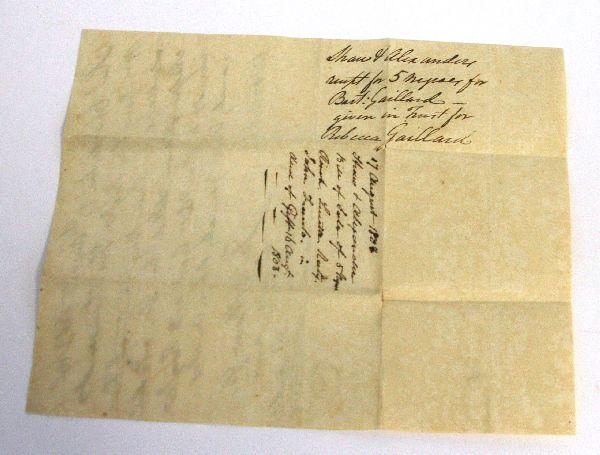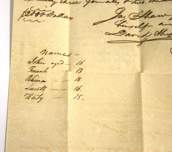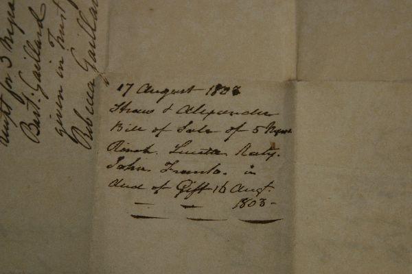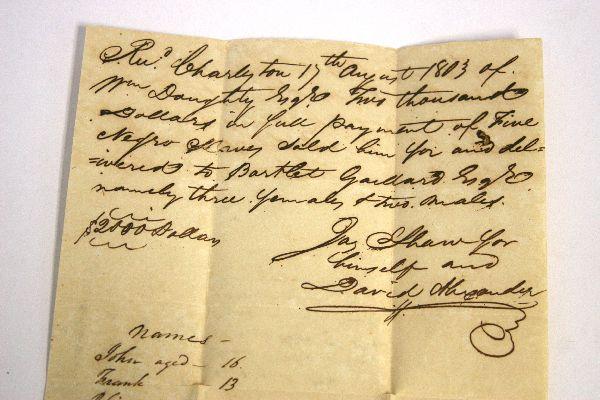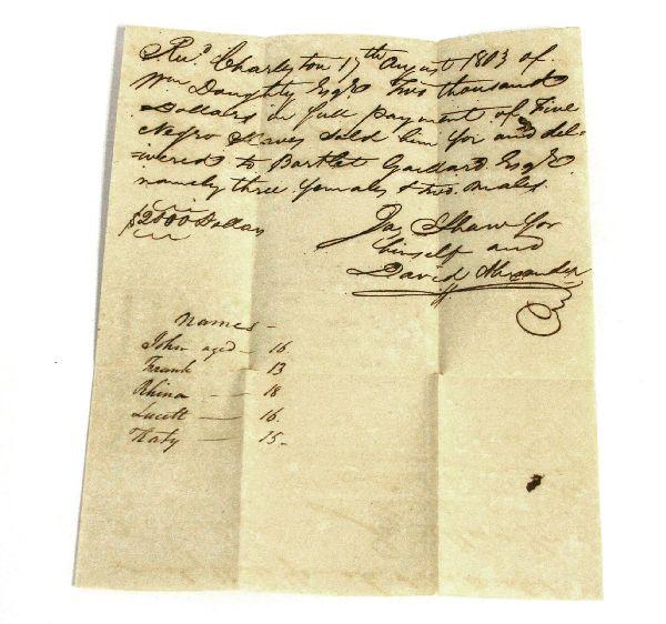 Dated August 17th, 1803 Charleston, South Carolina slave bill of sale of five slaves to one Bartlet Gallard for the sum of $2,000. Document gives the names of the two male and three female slaves and documents their ages. Overall good condition with heavy