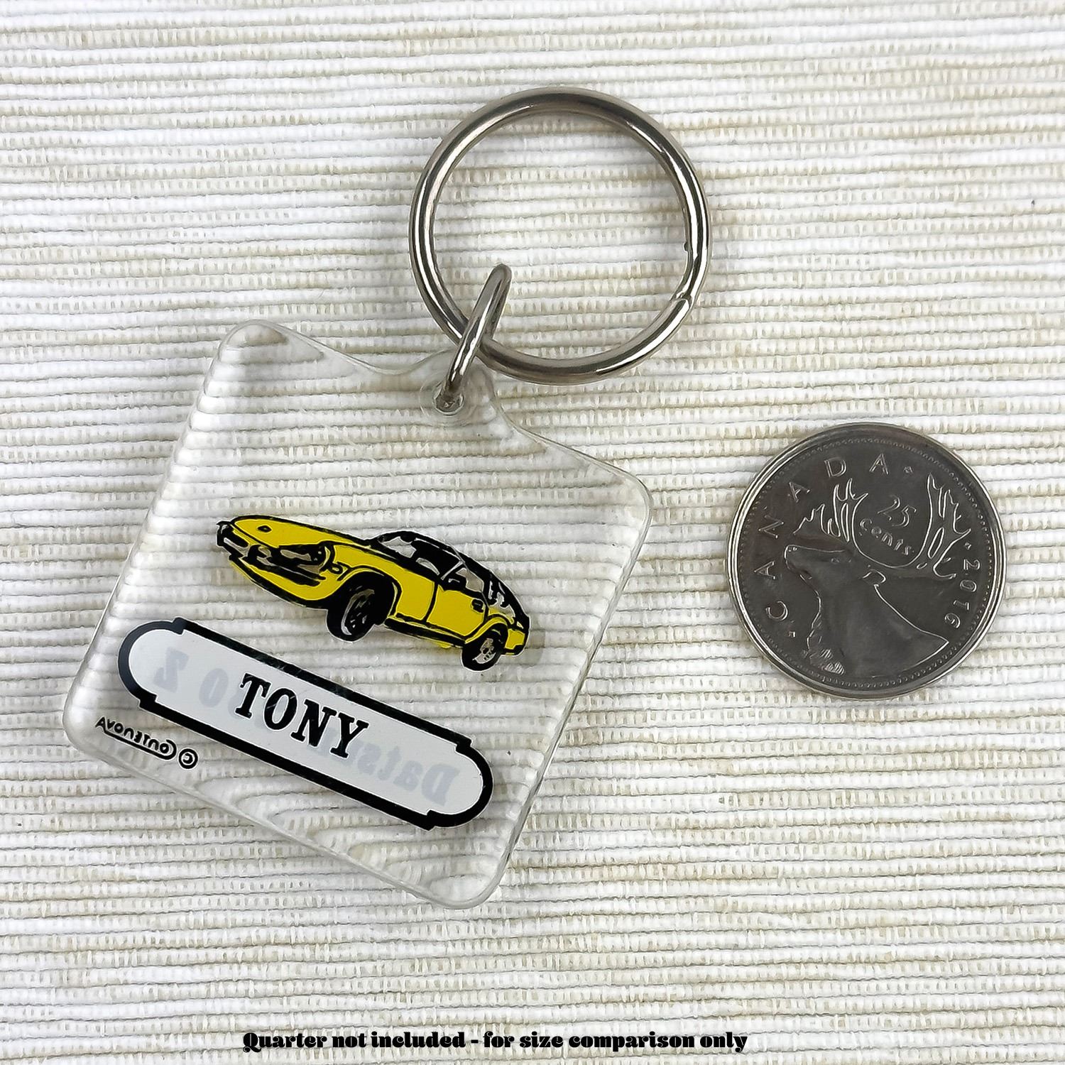 #8329 - VINTAGE PERSONALIZED “TONY” KEYCHAIN BY CONTENOVA. DATSUN 280Z - AUTO AUTOMOBILE SPORTS CAR 1970’S ADVERTISING