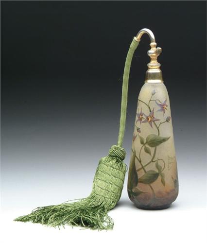 DAUM ATOMIZER. Beautiful Daum cameo and enameled atomizer has lovely purple, gray and yellow flowers on green leaves and stems against an acid textured amber background. Signed on the side in cameo "Daum Nancy". Bottle is topped with original atomizer assembly with replacements hose, bulb and cover. SIZE: 8-1/4 in. t. CONDITION: Very good to excellent. 5-61230