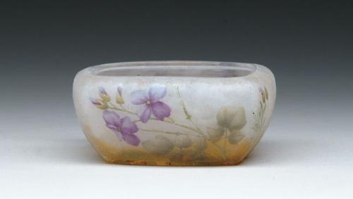 DAUM CAMEO AND ENAMEL BOWL. Very pretty Daum bowl has cameo and enamel purple violets with green stems and leaves against an internally decorated background of orange, green shading to white. SIZE: 3-1/4 in. sq. CONDITION: Rim appears to have been ground, otherwise very good. 5-61275