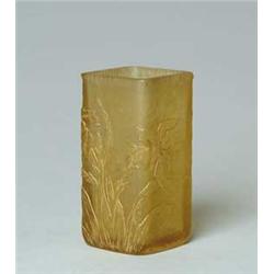 Lot 1262 DAUM CAMEO VASE. Lovely square amber colored vase has cameo iris flowers and leaves which is highlighted in gold gilt. Background is acid textured with gold gilt trim at foot. Signed on bottom in gold "Daum Nancy" with Cross of Lorraine. SIZE: 4-1/2" t. CONDITION: Two tiny chips to edge of foot and one flake to underside, otherwise very good. 5-69322 (400-600)