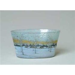 Lot 1199 DAUM DUTCH WINTER SCENE. Outstanding Daum bowl features cameo cut buildings, windmills, pond and trees against a mottled blue, yellow and clear background. Buildings, trees and ground are all enameled with white snow and trees are highlighted in gray. Signed on bottom "Daum Nancy" with Cross of Lorraine and "AL". SIZE: 4" x 6" x 3-1/4" t. CONDITION: Very good to excellent. 5-69217 (2,000-3,000)