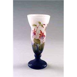 DAUM FRÈRES, Nancy Vase, farbloses Glas mit weißen, im Standbereich mit dunkelblauen Pulvereinschmelzungen. Umlaufend geätztes, mit Emailfarben und Gold bemaltes Fuchsiendekor vor eisglasartig geätztem Hintergrund. Über rundem, abgeschrägtem Tellerfuß mit Nodus kelchförmiger Gefäßkörper, im oberen Drittel eingeschnürt. H.: 16 cm. Bez.: DAUM NANCY mit Lothringer Kreuz, hochgeätzt. Um 1895-1900 Lit.: Blount, Berniece und Henry, French Cameo Glass, Des Moines/ Iowa 1968, Abb. S. 86-87, Nr. 128+130c (zum Dekor).