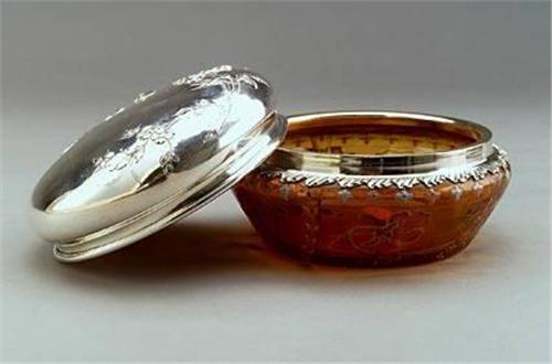 Dose,<BR> Glas, Silber. Bernsteinfarbenes Glas mit tiefgeätzem floralem Dekor und Emailbemalung in Rosé und Hellblau mit Goldstaffage. Flache gedrückte Form mit eingezogener Schulter. Die weite Mündung mit Silberfassung. Gewölbter Silberdeckel mit floralem Reliefdekor. H.: 9,8 cm, Ø 14,5 cm. Bez.: Daum Nancy mit Lothringer Kreuz, im Deckel: Silbergarantiemarke, Meistermarke. Um 1900<BR>