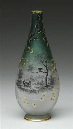 DAUM FRENCH CAMEO VASE. Fine vase with Aesop fable of "The Crow and the Fox" decoration. Acid-etched enamel and gilded. Signed on underside with gilded signature "Daum Nancy". SIZE: 8" t. CONDITION: Very good to excellent. 5-62174