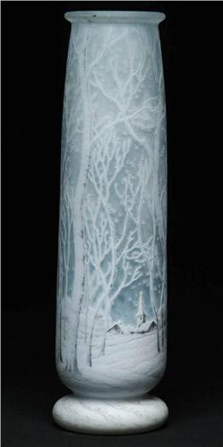 DAUM FRENCH CAMEO VASE. Wonderful and fine acid-etched and enamel winter scenic vase with church and houses in snow covered forest. Artistic enameled signature "Daum Nancy" on underside. SIZE: 14" t. CONDITION: One nick to top rim, otherwise very good to excellent. 5-62168