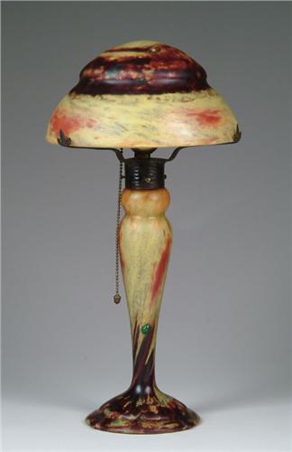 DAUM INTERNALLY DECORATED LAMP. Spectacular Daum lamp is internally decorated with flowing and swirling colors of yellow, brown, orange and green. The shade features an applied amber colored beetle with legs etched into the shade. The base is decorated with two applied lady bugs, one in red and one in green each having legs etched into the base. Shade is signed "Daum Nancy". SIZE: Shade is 9 in. dia. Overall height is 18 in. CONDITION: Socket appears to be an old replacement, otherwise very good to excellent. 5-61076