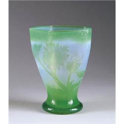 Lot 541 DAUM MARTELE SUNFLOWER VASE Absolutely beautiful Daum vase has light green cameo sunflowers against a martele background of white opalescent shading to green. Vase slowly flares out to a five-sided mouth. Signed on bottom “Daum Nancy” with Cross of Lorraine. SIZE: 7-1/4” t. CONDITION: Very good to excellent. 5-70982