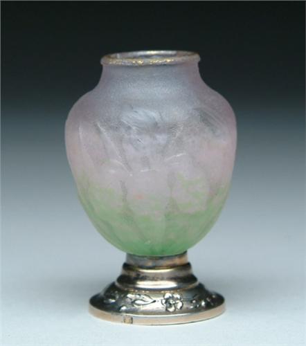 DAUM MINIATURE VASE. Pretty little vase has cameo carved iris with stem and leaves against an internally decorated mottled green to pink to frosted background. Vase sets on silver decorated foot. Signed on the side in gold "Daum Nancy". SIZE: 2-1/2 in. t. CONDITION: Very good to excellent. 5-61109