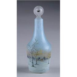 Lot 573 DAUM NANCY BOTTLE WITH STOPPER Very pretty Daum Nancy cameo and enameled bottle in winter scene decoration with wind mills. Stopper is decorated with flying birds. Signed “Daum Nancy”. SIZE: 7” t. including topper. CONDITION: Good but with possible grinding to top of bottle. 5-70366