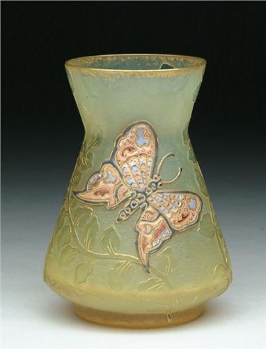 DAUM NANCY CAMEO AND ENAMEL VASE. Petticoat shaped vase with citron colored cameo decoration of leaves and vines and an elaborately enameled butterfly in colors of beige, blue and gray. Signed on the underside "Daum Nancy". SIZE: 4-3/8 in. t. CONDITION: Very good to excellent. 5-60636