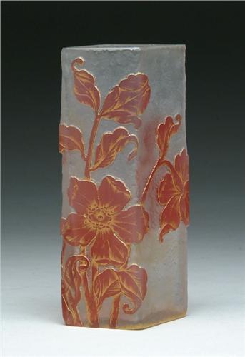 DAUM NANCY CAMEO VASE. Four sided vase with a cranberry cameo decoration of flower blossoms and leaves with gold enamel highlights on a chipped ice background. Signed on underside in gold script "Daum Nancy". SIZE: 7 in. t. CONDITION: Very good to excellent. 5-60641