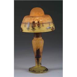 Lot 583 DAUM NANCY LAMP Sailboat and harbor scene nicely enameled on a mottled orange and yellow background. Signed “Daum Nancy” with Cross of Lorraine. SIZE: 14” t. CONDITION: Very good to excellent. 5-70792