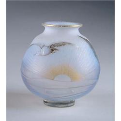Lot 570 DAUM NANCY OCEAN SCENE VASE Iridescent glass vase etched and gilt with seagulls and a rising sun, also carved with tortoises rising from the sea. This decoration may be further referenced in the book, “Glass Art Nouveau to Art Deco” by Victor Arwas, page no. 46. Signed “Daum Nancy” with Cross of Lorraine on bottom in gold gilt. SIZE: 7-1/2” t x 6” w. CONDITION: Very good, wear to gold gilt, minor imperfections in the making. 5-70570