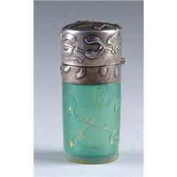 Lot 725 DAUM NANCY PERFUME Green frosted glass with cameo floral pattern. Complimentary silver lid and original glass lid, as well. Highlighted with gold gilt. Signed “Daum Nancy” in gold gilt. SIZE: 3-1/4” t. CONDITION: Very good to excellent. 5-70772