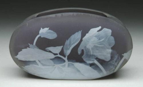 DAUM NANCY PILLOW VASE. Beautiful Daum Nancy oval-shaped pillow vase with a white floral decoration on all sides set against an amethyst ground. Signed “Daum Nancy” in cameo. SIZE: 4” t x 7” w. CONDITION: Very good to excellent. 5-61711