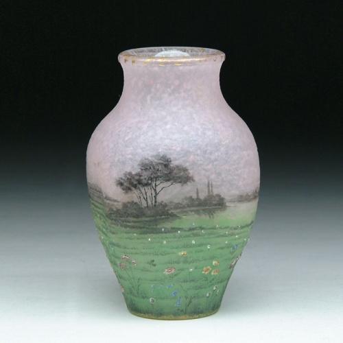 DAUM NANCY PRAIRIE VASE. Very rare Daum prairie vase has internally decorated green grass background with enameled highlights and beautifully enameled spring prairie flowers done in red, yellow, white and blue. Green grass gives way to black enameled trees and islands in the distance. All set against an internally decorated rich pink background. Signed on the underside in gold "Daum Nancy". SIZE: 4-3/4 in. t. CONDITION: Very good to excellent. 8-87330