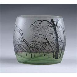Lot 575 DAUM NANCY RAIN SCENE VASE Nice pillow form enameled rain scene vase. Signed “Daum Nancy” with Cross of Lorraine. SIZE: 4-3/4” t. CONDITION: Good with possible grinding to top rim and minute pinhole flakes to interior rim. 5-70533