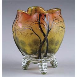 Lot 576 DAUM NANCY VASE Winter scenic cameo and enamel decorated vase. Bulbous form supported by four feet. Nearly illegible “Daum Nancy” signature on bottom. SIZE: 5-1/2” t. CONDITION: Very good to excellent. 5-70362