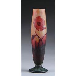 Lot 522 DAUM NANCY WHEEL CARVED VASE Beautiful poppy decoration on nicely mottled background with engraved “Daum Nancy” signature. SIZE: 11-1/2” t. CONDITION: Very good to excellent. 5-70555