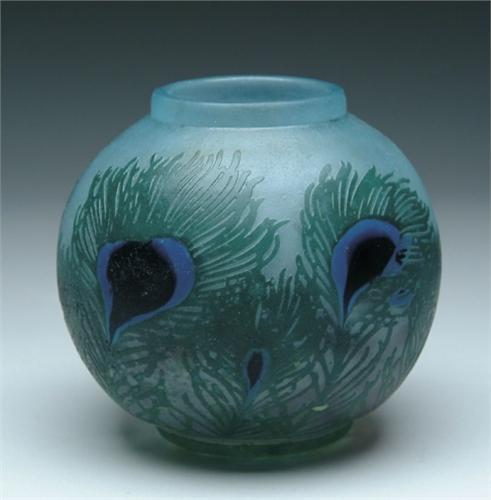 DAUM PADDED PEACOCK VASE.  Fantastic Daum vase has green cameo peacock feathers with padded centers of dark blue surrounded by light blue.  All is set against a very light blue internally decorated background.  Signed on the side in cameo "Daum Nancy".  SIZE:  5-1/2 in. t.  CONDITION:  Very good to excellent.  5-61087