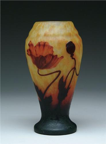 DAUM PADDED VASE. Extremely fine Daum vase has two large padded and wheelcarved poppies against a mottled yellow background. The vase is finished with dark brown cameo leaves, stems and buds. Signed on side of foot "Daum Nancy France". SIZE: 9-1/4 in. t. CONDITION: Very good to excellent. 5-61131