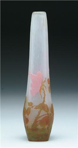 DAUM ROSE VASE. Very rare Daum vase has two padded and wheelcarved pink roses as well as a new opening bud. Leaves and stems are done in mottled green and brown, all against a frosted background. Signed on the underside with etched signature "Daum Nancy". SIZE: 7-3/4 in. t. CONDITION: Very good to excellent. 5-61125
