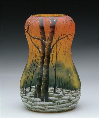 DAUM WINTER SCENE VASE. Classic Daum winter scene design features cameo and enamel barren trees on snowcovered ground. Cameo design is set against a mottled orange and yellow background. Trees are highlighted with bits of snow. Signed on the underside "Daum Nancy". SIZE: 5-1/2 in. t. CONDITION: A couple of open bubbles on backside of vase, definitely from mfg, otherwise very good to excellent. 5-61339