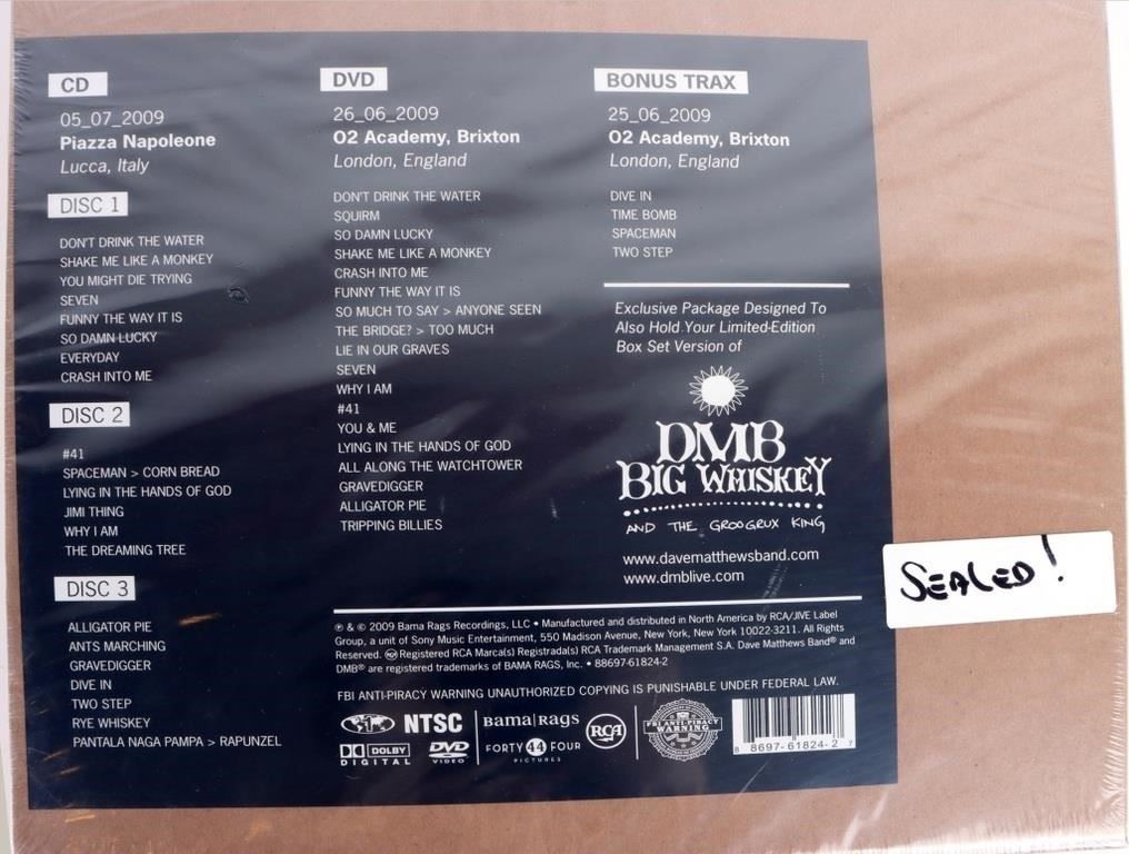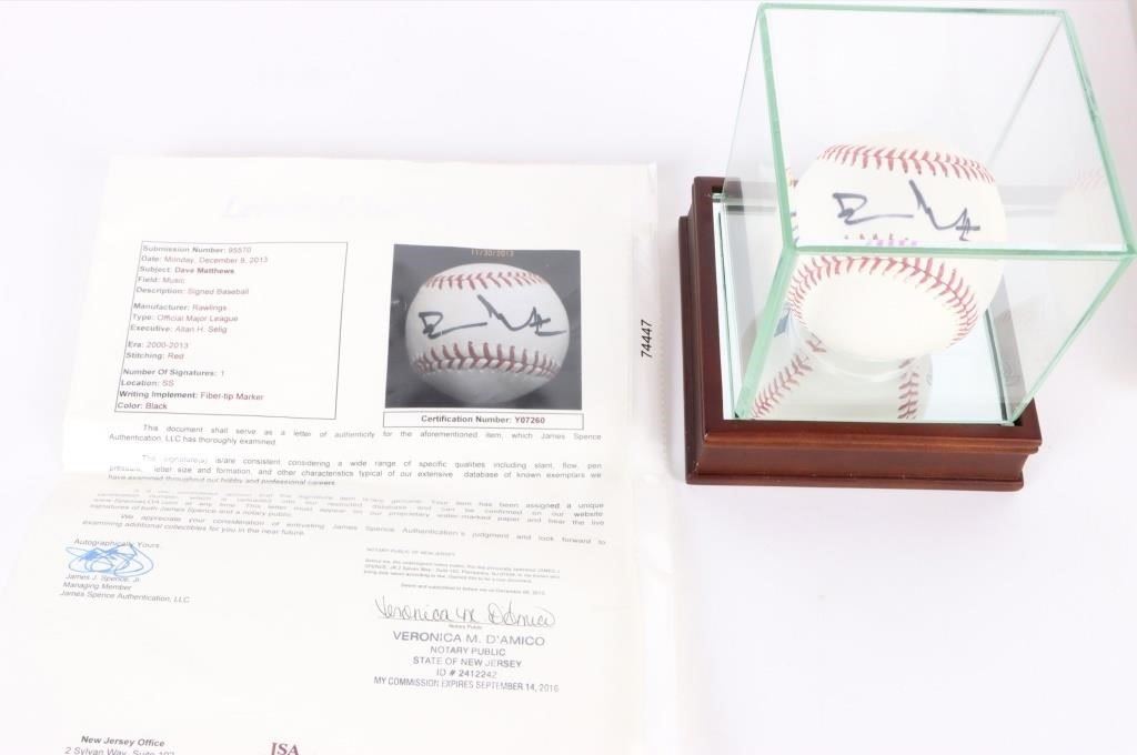 Dave Matthews and Dave Matthews band autographs and memorabilia to include: one autographed Dave Matthews baseball with JSA authentication and glass case, one Dave Matthews autographed photo, one Dave Matthews Band multiple autographed photo, and one Dave Mathews Band 2009 Europe Box Set with 3 CDs/ 1 Live DVD with DMB Big Whiskey and the Goo Grux King.