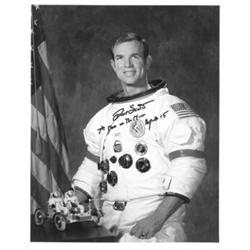 DAVE SCOTT: American astronaut who walked on the moon during the Apollo 15 mission. Rare S.P. 8" x 10" color, a NASA photo showing Scott half-length in an Apollo space suit with a model of the space buggy at his right hand, boldly signed: "Dave Scott 7th Man on the Moon Apollo 15". Fine. $200-300