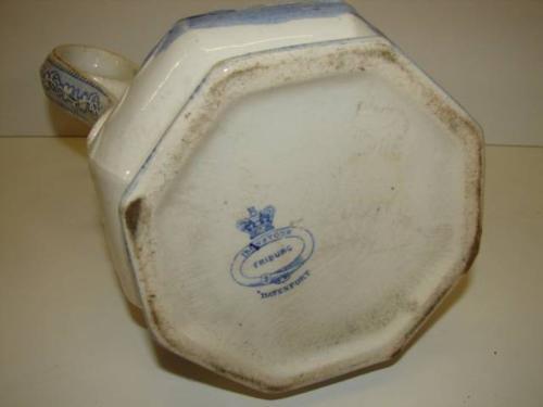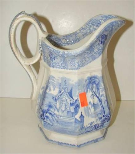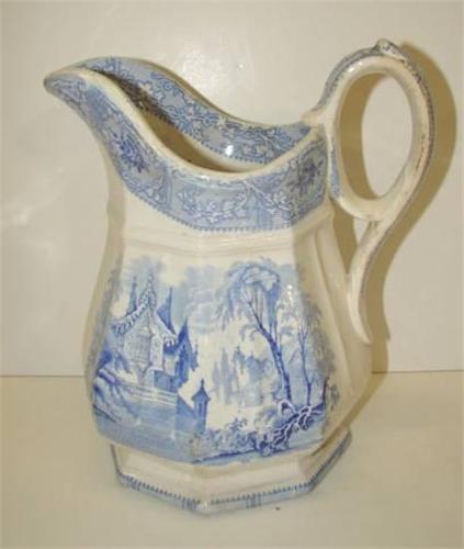 DAVENPORT (1830-1880) IRONSTONE BLUE TRANSFERWARE PITCHER. Friburg pattern. Marked on bottom. 8.5" H