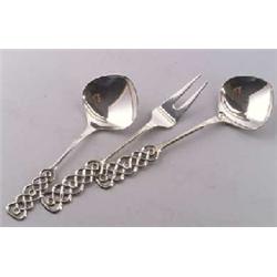 Silber. 1 Fleischgabel, 2 Vorlegelöffel mit breiten spitz zulaufenden Laffen. Die schmalen Schäfte mit durchbrochenen geflochtenen Griffenden. L.: 18,7 - 21 cm. Bez.: Firmenmarke, Feingehaltsmarke 830S. 1960er Jahre
