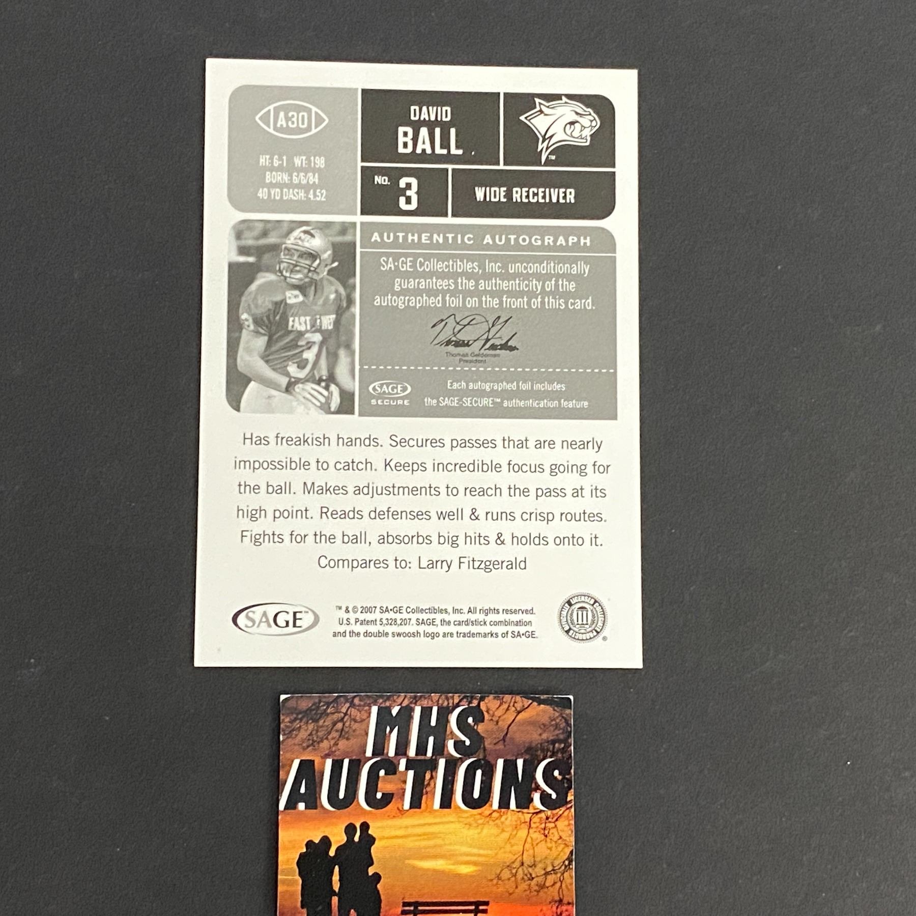 DAVID BALL 2007 SA-GE COLLECTIBLES AUTOGRAPHED FOOTBALL CARD