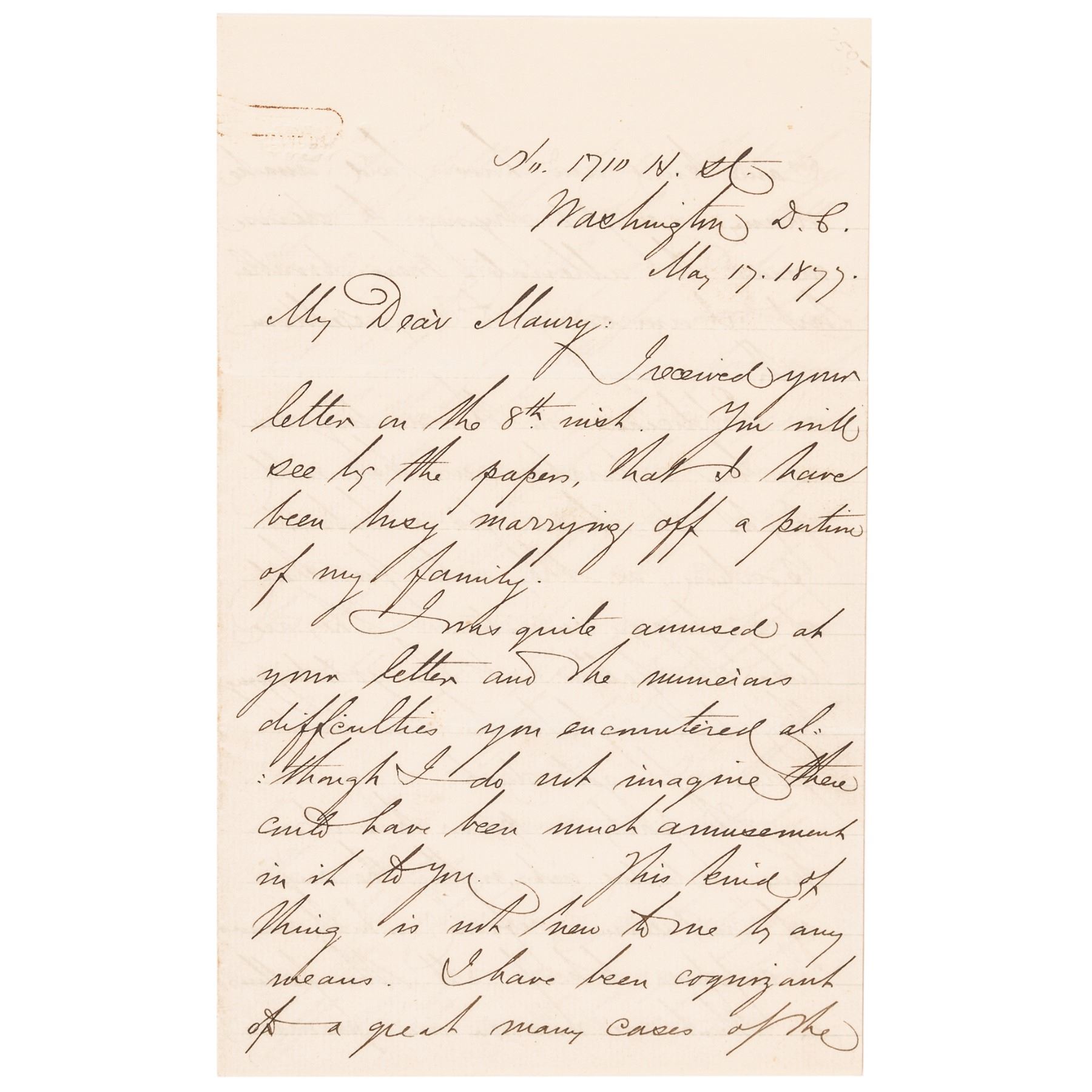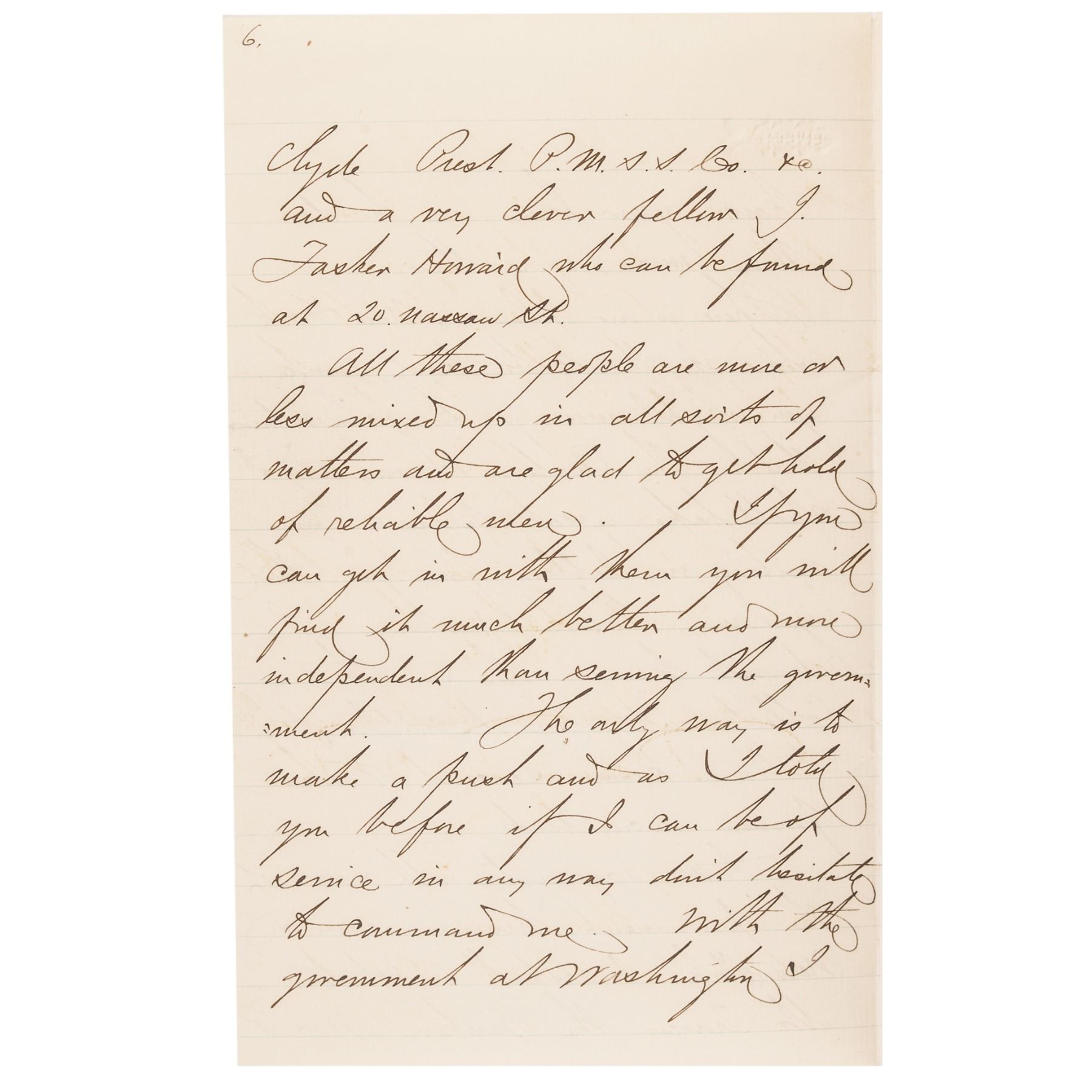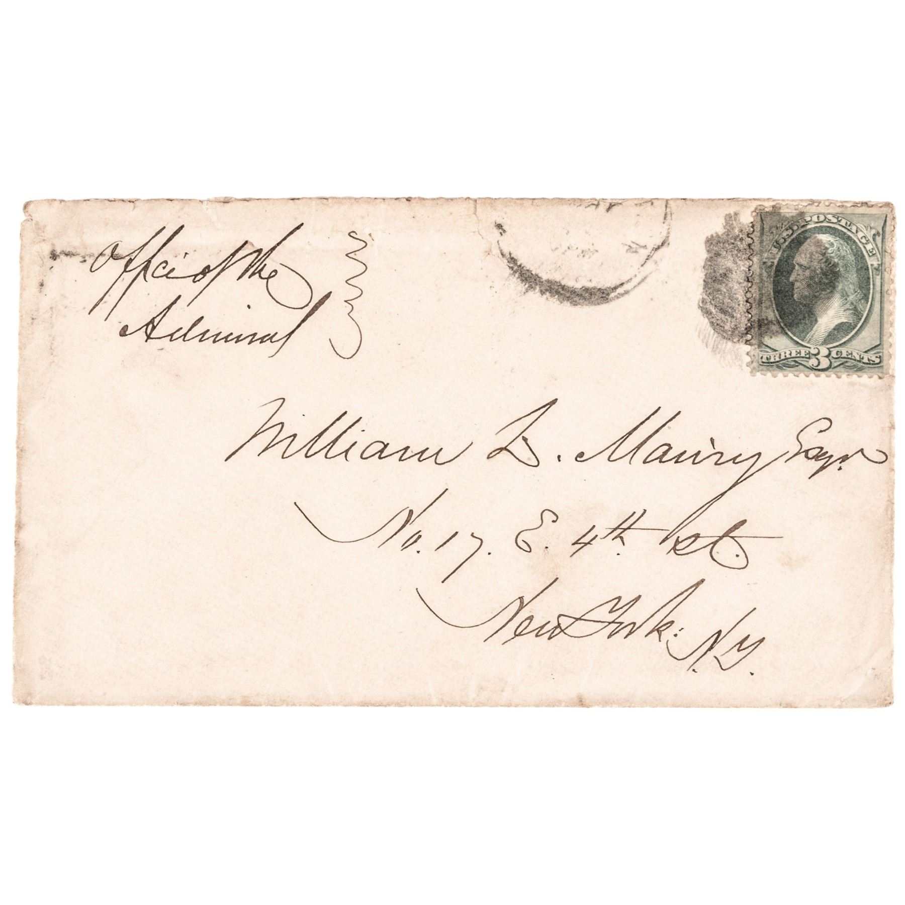 May 17, 1877-Dated Autograph Letter Signed, “David D. Porter,” written from Washington, D.C., to William Maury, 7 pages, octavo, 5” x 8”, Choice Extremely Fine. Great content letter from Porter, in which he criticizes the current administration, accusing them of being hypocritical as far as civil service reform is concerned, and complains of ill treatment of career naval personnel. It reads, in part: “... Politicians in this country ... are like the fellows at the gold diggings, they don’t neglect the smallest grain of gold dust. ....” Rutherford Birchard Hayes was President in 1877. Paper in excellent condition, with a rust mark from a paper clip in upper left of first page and an erased pencil notation in upper right corner. Comes together with its original stamped transmittal envelope. (2 items)