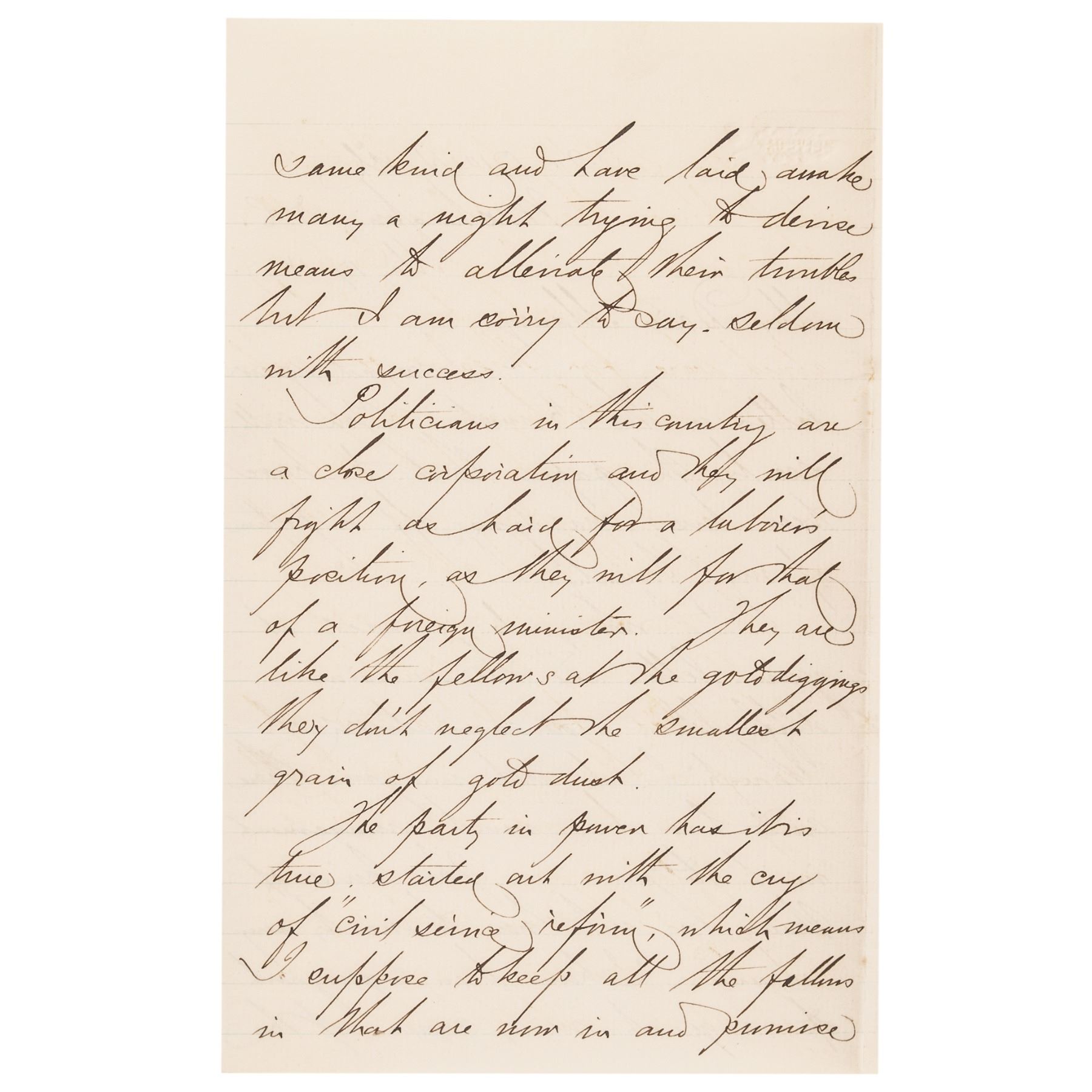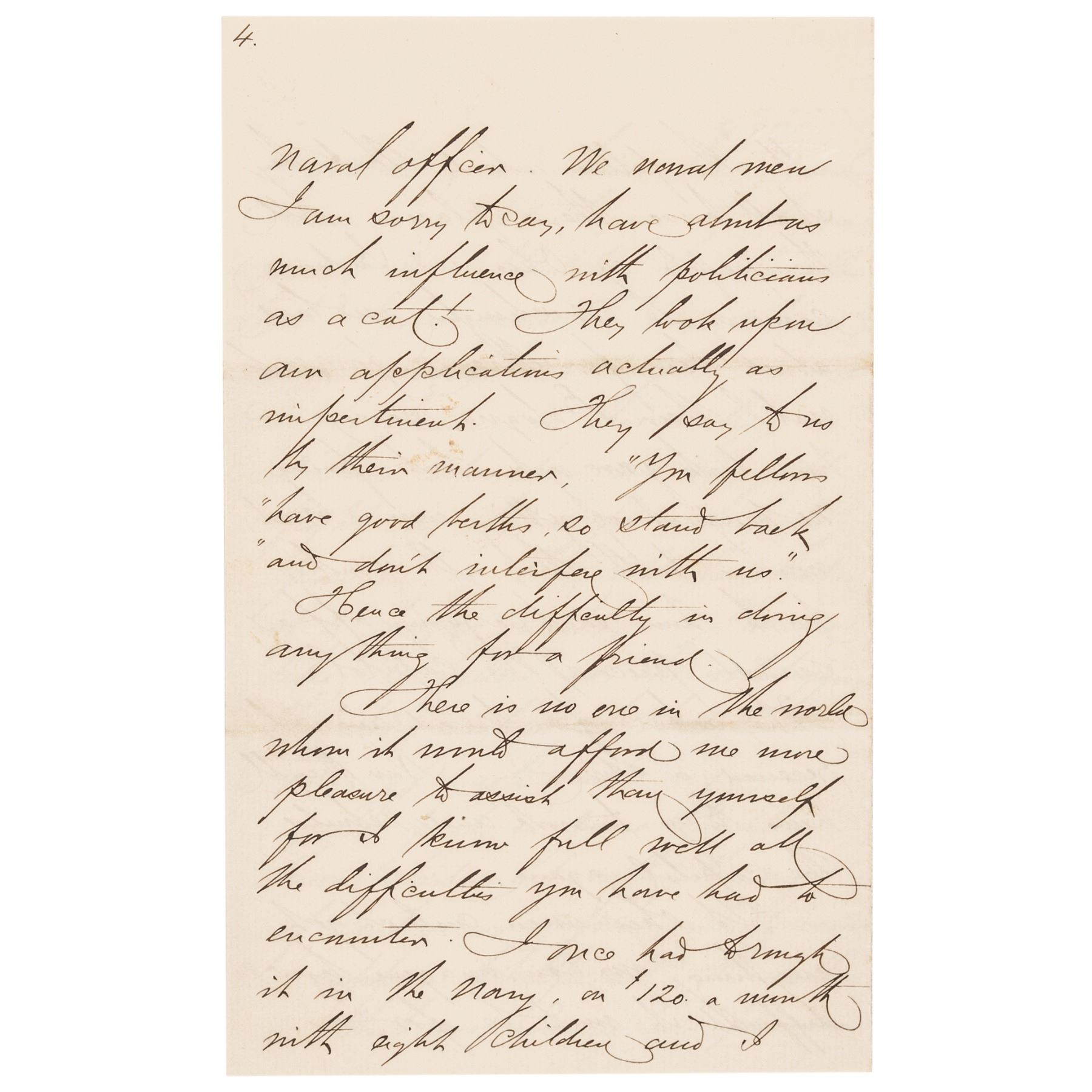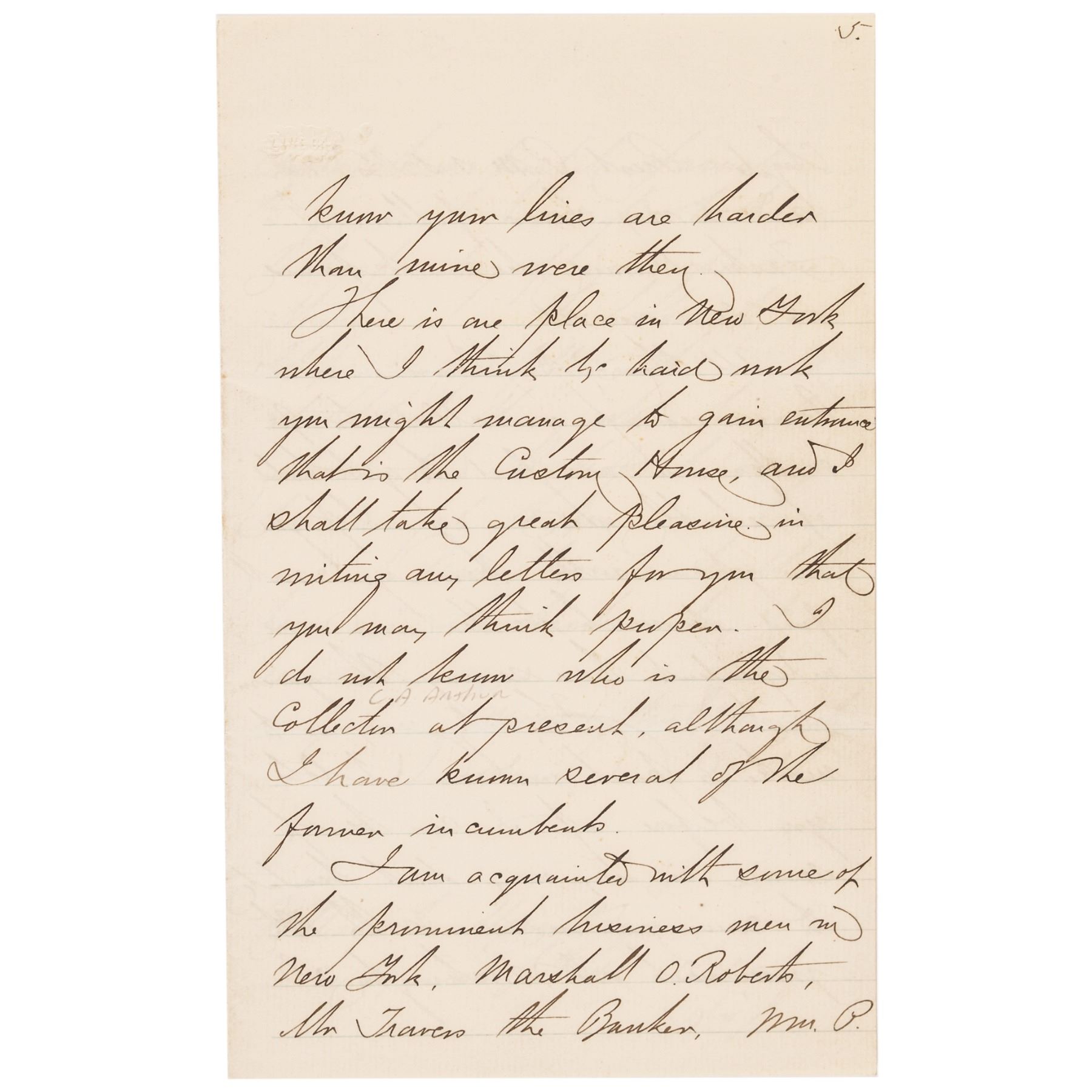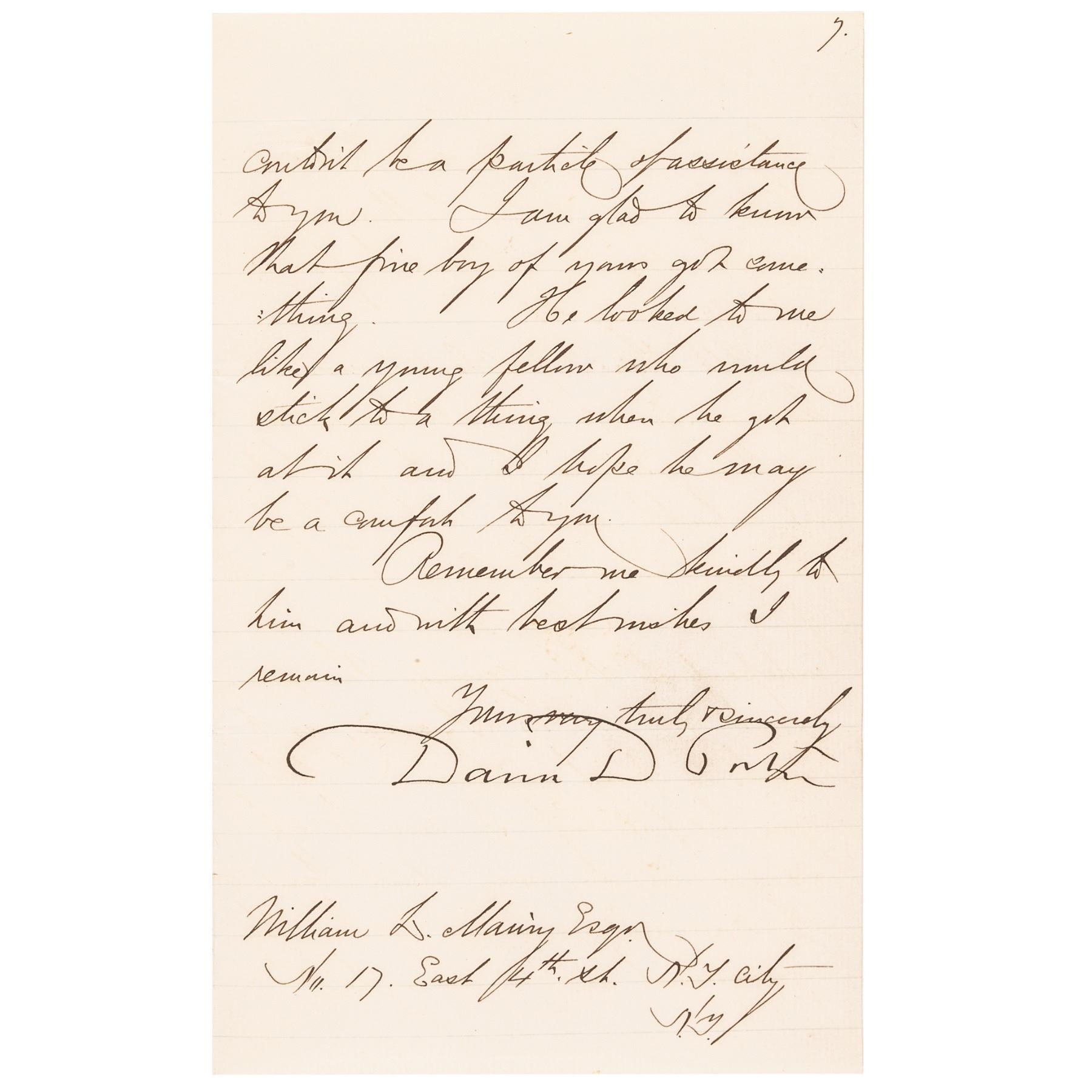 May 17, 1877-Dated Autograph Letter Signed, “David D. Porter,” written from Washington, D.C., to William Maury, 7 pages, octavo, 5” x 8”, Choice Extremely Fine. Great content letter from Porter, in which he criticizes the current administration, accusing them of being hypocritical as far as civil service reform is concerned, and complains of ill treatment of career naval personnel. It reads, in part: “... Politicians in this country ... are like the fellows at the gold diggings, they don’t neglect the smallest grain of gold dust. ....” Rutherford Birchard Hayes was President in 1877. Paper in excellent condition, with a rust mark from a paper clip in upper left of first page and an erased pencil notation in upper right corner. Comes together with its original stamped transmittal envelope. (2 items)