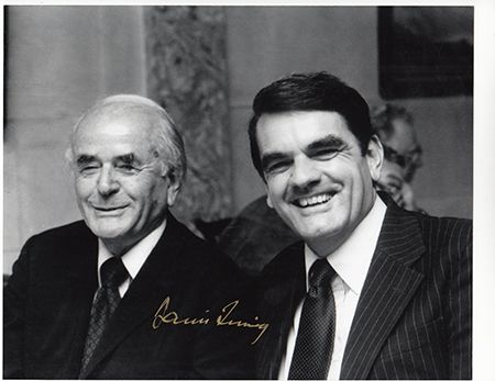(b. 1938) British writer, author of 30 books on Nazi Germany including The Destruction of Dresden, Hitler's War, and Churchill's War, accused of persistently and deliberately misrepresenting and manipulated historical evidence, particularly as regards the Holocaust. S.P. 10" x 8" b/w, a candid image of Irving standing beside Albert Speer. Fine.