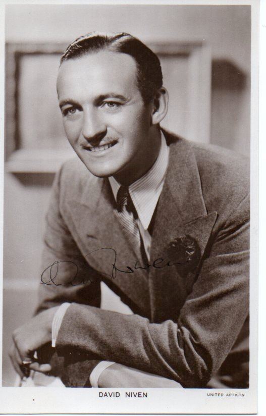 Born in London, Niven attended Heatherdown Preparatory School and Stowe before gaining a place at the Royal Military College, Sandhurst. After Sandhurst, he joined the British Army and was gazetted a second lieutenant in the Highland Light Infantry. Having developed an interest in acting, he left the Highland Light Infantry, travelled to Hollywood, and had several minor roles in film. He first appeared as an extra in the British film There Goes the Bride (1932). From there, he hired an agent and had several small parts in films from 1933 to 1935, including a non-speaking part in MGM's Mutiny on the Bounty. This brought him to wider attention within the film industry and he was spotted by Samuel Goldwyn. Upon the outbreak of the Second World War, Niven returned to Britain and rejoined the army, being recommissioned as a lieutenant.Niven resumed his acting career after his demobilisation, and was voted the second-most popular British actor in the 1945 Popularity Poll of British film stars. He appeared in A Matter of Life and Death (1946), The Bishop's Wife (1947), and Enchantment (1948), all of which received critical acclaim. Niven later appeared in The Elusive Pimpernel (1950), The Toast of New Orleans (1950), Happy Go Lovely (1951), Happy Ever After (1954) and Carrington V.C. (1955) before scoring a big success as Phileas Fogg in Michael Todd's production of Around the World in 80 Days. Niven appeared in nearly a hundred films, and many shows for television. He also began writing books, with considerable commercial success. In 1982 he appeared in Blake Edwards' final "Pink Panther" films Trail of the Pink Panther and Curse of the Pink Panther, reprising his role as Sir Charles Lytton.A 3x5 inch postcard signed by British actor David Niven.
